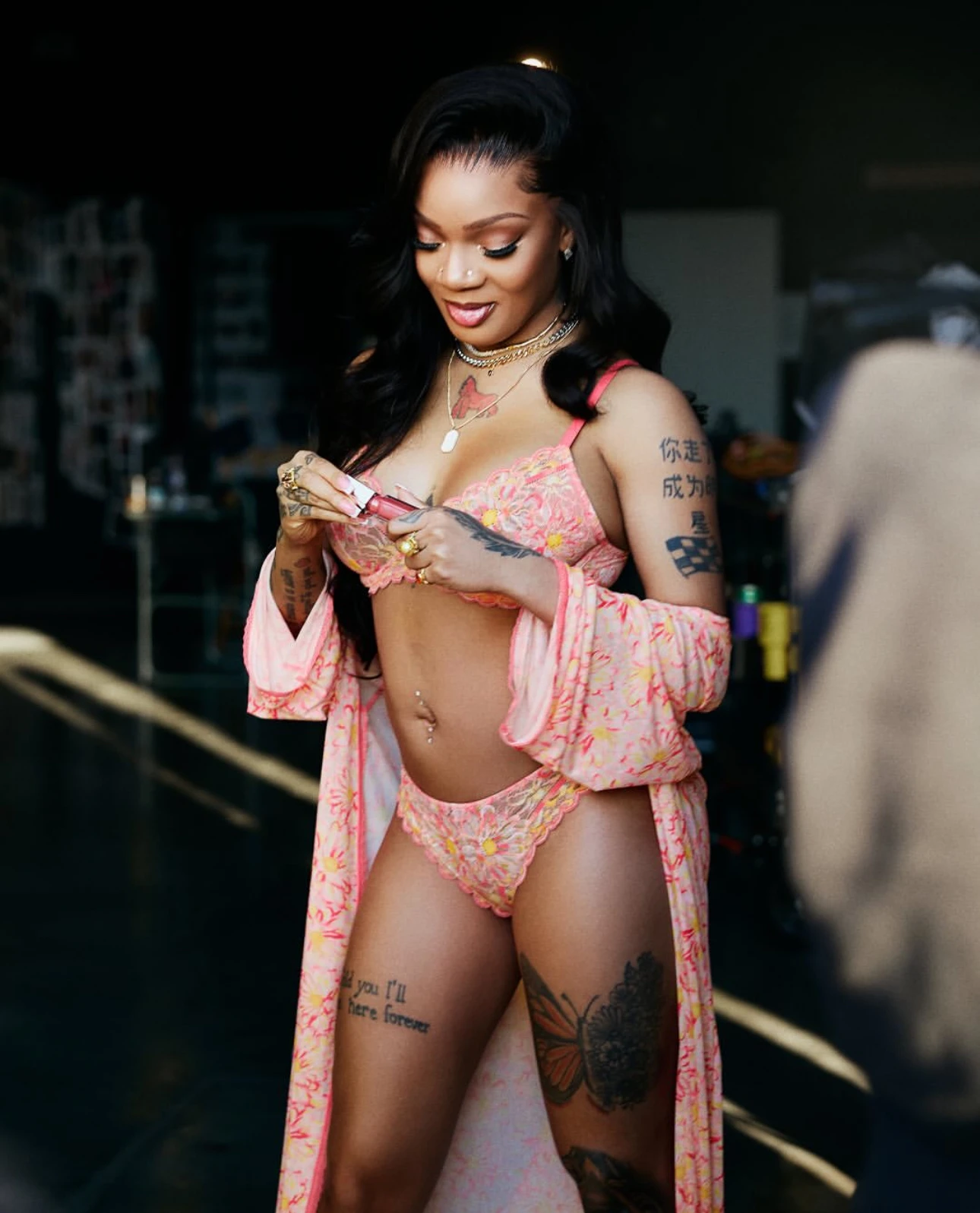 Adding to her growing list of accomplishments, GloRilla has become the first-ever ambassador across all of Rihanna’s Fenty brands: Fenty Beauty, Fenty Hair, Fenty Skin, and Savage x Fenty. Now, she’s turning heads with the release of Fenty’s new Sunray Lace collection, where she flawlessly showcases a lace plunge bra, thong, and robe that perfectly complement her signature butterfly thigh tattoo. The collection, available now on Fenty’s website, ranges from $25 to $95.